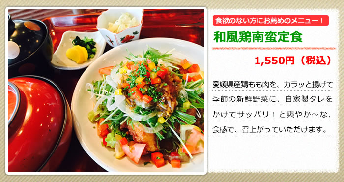 愛媛県産鶏もも肉を、カラッと揚げて季節の新鮮野菜に、自家製タレをかけてサッパリ!と爽やか~な、食感で、召上がっていただけます。食欲のない方にお薦めのメニューです!